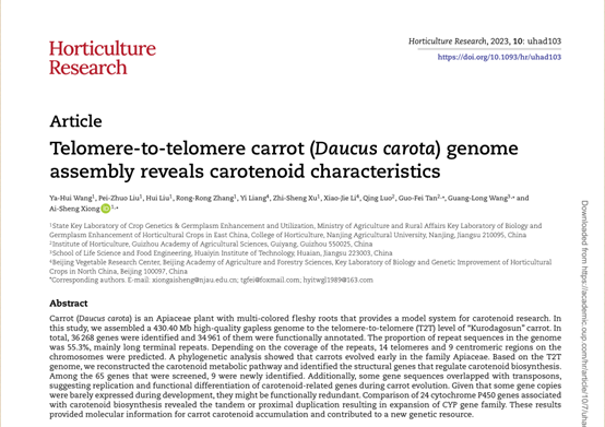 近日,公司王广龙副教授作为共同通讯作者,联合南京农业大学、贵州省农业科公司和北京市农林科公司,在国际高水平期刊Horticulture Research(Advance Access)(《园艺研究》)杂志上发表了题为"Telomere-to-telomere carrot (Daucus carota) genome assembly reveals carotenoid characteristics"的研究论文。