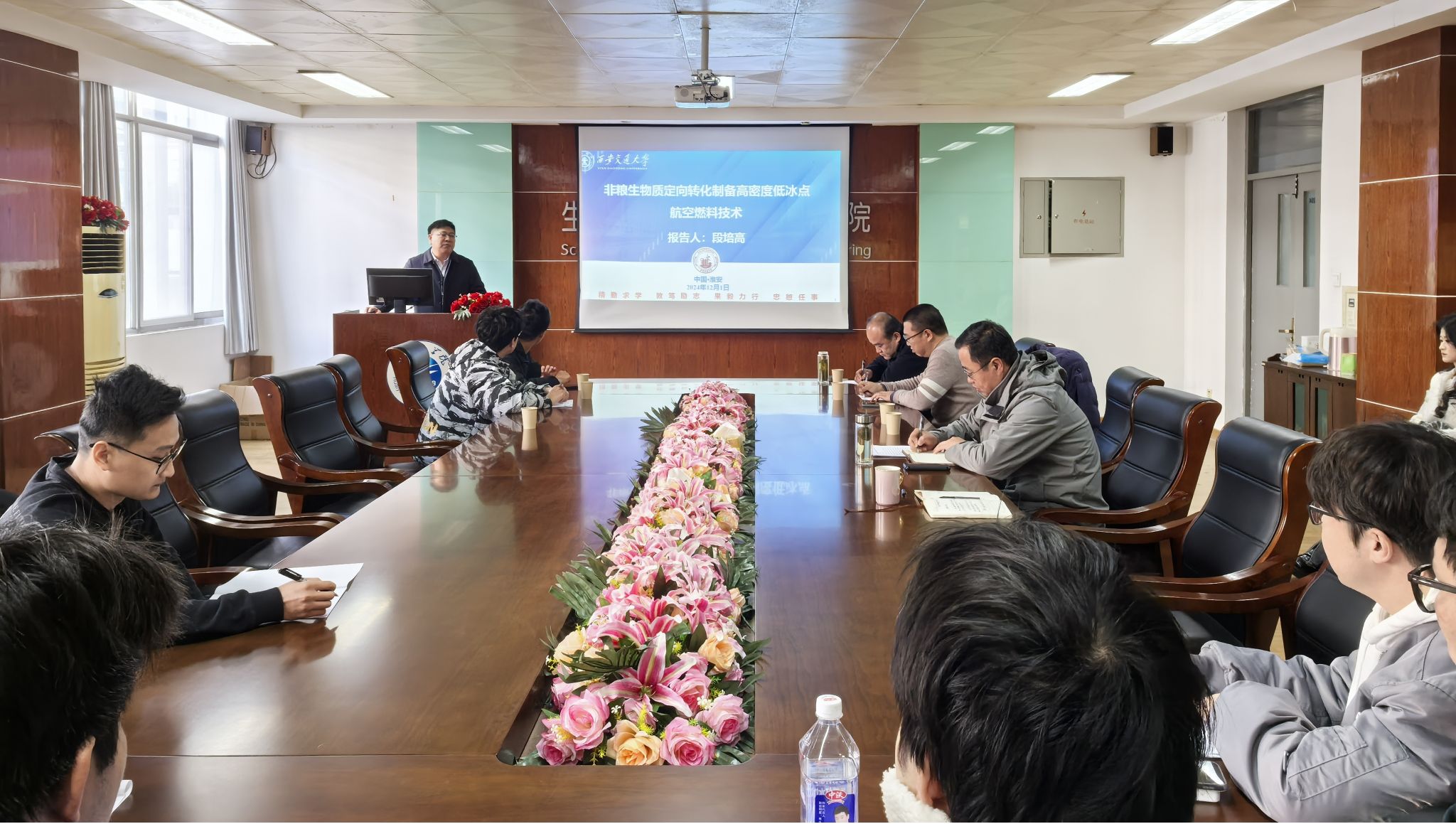在报告会上,段培高教授以“非粮生物质定向转化制备高密度低冰点航空燃料技术”为主题,深入浅出地阐述了生物质的基本概念、国家相关政策导向、生物质燃料的分类演进,以及热化学转化技术和生物油品质提升的方法。随后,他详细介绍了在生物质转化研究中采用的常规实验设备、具体原料种类,以及生物油梯级分离的独特工艺。最后,段教授着重分享了生物质加氢提质领域的最新研究进展。