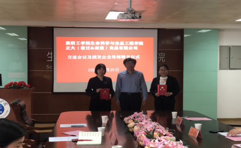 党委书记朱永江向正大食品(宿迁)有限公司总裁魏范波先生、副总裁孙海燕女士颁发了企业导师聘书。