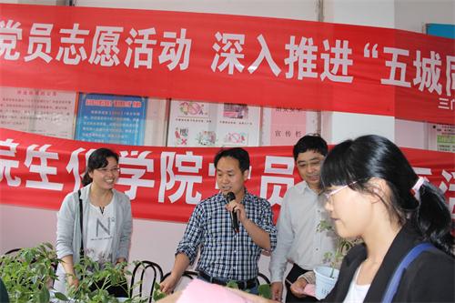 本次活动前期,生化公司培育了500余株适合家庭阳台和田间种植的番茄、辣椒、黄豆、南瓜、露草等秧苗,并精心制作了宣传展板、宣传单。活动开始,园景系教师向社区居民简要介绍了阳台园艺的特点、植物选择要素,重点介绍了居民们日常生活中常见的番茄、辣椒栽培要点。活动受到了小区居民们的热烈欢迎,现场群众表现踊跃。在和现场居民群众交流中,刘强辉书记表示,活动经过了精心策划,用我们自身优势,亮出了党员身份,在实际行动中为社区群众服务。