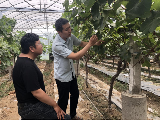 活动期间,党员教师到淮海农场高效园种植园区查看苗木生长情况。王云鹏教授现场就葡萄膨果期管理、梨树和桃树等果树病虫害防治给予技术指导。靳丛博士向技术员手把手地传授葡萄打枝、绑蔓和疏果技术。