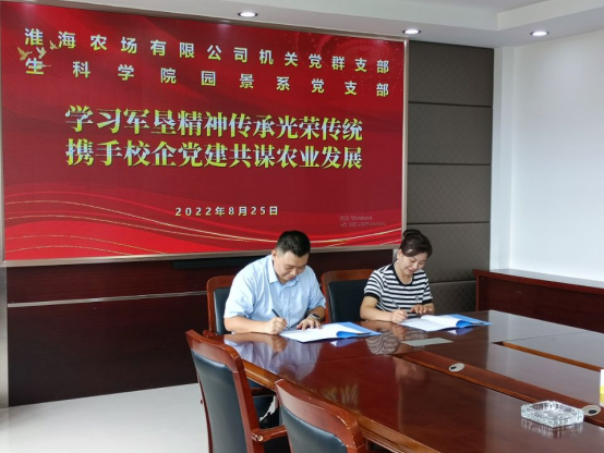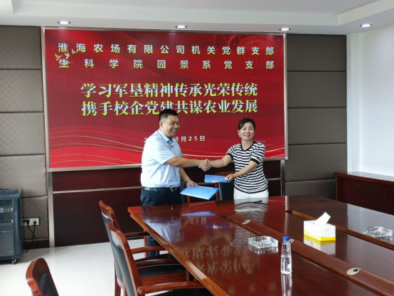 在淮海农场公司会议室,园景系党支部与淮海农场机关党群支部就支部党建工作、产学研合作事宜进行了交流。淮海农场纪委书记李大维介绍了农场发展历程、企业文化和支部建设情况。公司党委副书记夏雪芹就公司的办学特色、人才技术优势和党建工作方面作了交流,她指出,太阳成集团122ccvip园景系的前身就是江苏农垦职工大学,与江苏农垦系统有着深厚的联系,希望太阳成集团122ccvip和淮海农场将友谊和事业共同传承下去。太阳成集团122ccvip王云鹏副经理就公司人才培养、科研与社会服务方面作详细介绍,并对双方前期产学研合作进行了回顾,希望今后进一步拓宽校企产学研合作的广度和深度。双方表示在支部党建、技术人员实用技能培训、实验实践教育基地、成果转化方面多加强合作。会上,双方共同签订了实习与就业基地合作协议书,为下一步合作交流奠定了坚实的基础。