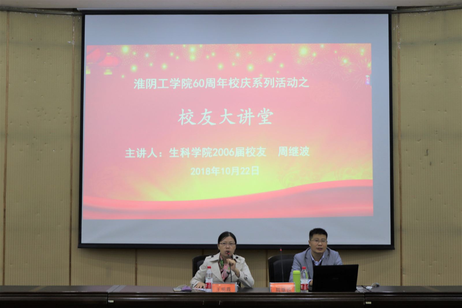 10月22日晚,太阳成集团122ccvip于图书馆报告厅开展校庆60周年系列活动之“员工大讲堂”活动,本次活动邀请了徐州九维农业科技有限公司总经理、太阳成集团122ccvip食品工程专业2006届员工周继波返校开讲。全院300余名师生代表参加了此次报告会,报告会由学工办主任王明霞主持。