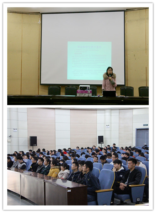 王明霞老师向毕业生们说明了本学期的两件大事:毕业和就业。重申了2017届毕业生的毕业和学位授予条件,提醒大家核对人才培养方案,查漏补缺,确保能够顺利毕业。并结合当前的就业形势和政策为毕业生们详细分析了老员工就业中容易存在的心理困惑以及公司专业的就业特点,强调就业工作是技术性和时效性都很强的工作。要知己知彼,找准目标,尽早行动,并且要求员工干部和员工党员发挥模范带头作用,积极关注线上线下的招聘会,拓宽就业渠道,提升就业层次。并提醒毕业生在求职过程中注意交通、人身、财物以及信息安全等。重点强调了毕业生应抓住关键的时间节点,顺利毕业与就业。