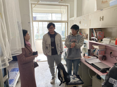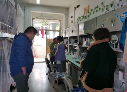 在宿舍检查过程中,老师们询问同学们新学期返校后的生活和学习情况,针对用水用电安全、宿舍通风和卫生等方面存在的问题及时提出、指导同学们改正。