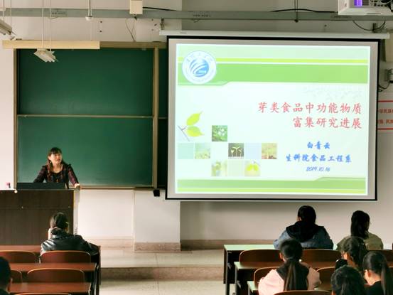 白老师首先介绍了食品专业的主要范畴,指出食品专业与农业专业、生物专业等息息相关,其次列举了许多富硒食品,强调食品的发展方向众多,鼓励同学们深入学习研究。接着,她就“芽类食品概述”、“芽苗食品种类与特点”、“发芽过程储藏物质变化”、“发芽过程功能物质富集”、“芽类食品开发现状及前景”五方面进行演讲,指出芽类食品营养价值更高、保健作用更强,更容易被人体吸收。最后,白老师指出,芽类食品正在兴起,其必将引起芽类食品研究领域的科研工作者的兴趣,希望同学们也能更多得了解食品专业,深入学习。