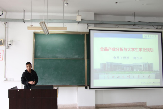 首先,蒋主任明确了食品产业的概念以及食品产业在社会生产实践中的重要性,再结合数据和图表表明食品产业近年来主要产品产量稳步增长、产业结构不断优化、食品工业区域发展差距缩小、食品产业固定资产投资规模继续扩大、食品质量水平稳步提升、食品行业集中度提高、食品进口出口呈增长趋势等可观的食品产业现状,然后蒋主任给同学们分析了食品产业背后存在的类似于食品资源“紧平衡”、耕种土地减少、耗能高、污染大的问题。最后蒋主任针对食品产业的未来的发展机遇,归纳了七结合解决问题的方法,即:兴趣需求相结合、远近目标相结合、理论实践相结合、专业学科相结合、校外校内相结合、课内课外相结合、专业内外相结合。