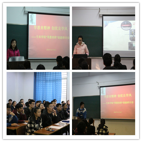 会议伊始,王明霞老师结合公司的校训阐述了创建“周恩来班”的目的和意义,以及公司“周恩来班”创建评比量化指标,她强调班级要围绕“学周、知周、行周”的主题开展特色的班级活动,在开展创建活动的过程中促进良好班风、学风的形成。接着获得校第九届“周恩来班”以及江苏省先进班集体荣誉的食品1132班班长李文龙和团支书朱胜男同学分别向大家介绍了食品1132班在创建“周恩来班”过程中的一些做法与经验,他们指出从大一开始就要有争创优秀班集体的意识,点滴积累,在创建过程中收获成长。最后,王明霞老师与同学们交流了在创建”周恩来班“的过程中所遇到的困难,并提出了指导性的解决方案。