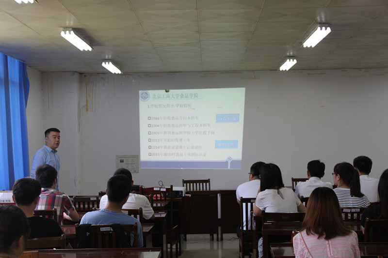 宣讲会上,程博士首先介绍了北京工商大学的概括,北京工商大学是北京市重点建设的多科性大学,是国务院批准的全国首批硕士学位授予单位,以经、管、工为主,经、管、工、理、文、法、史等学科相互支撑、协调发展的多科性大学。北京工商大学大学的食品专业通过了美国IFG(美国食品科学技术协会)专业认证,国内只有四家高校通过此认证。程博士还介绍了北京工商大学实验室的条件与设备、公司的科研平台与研究生发展前景等。