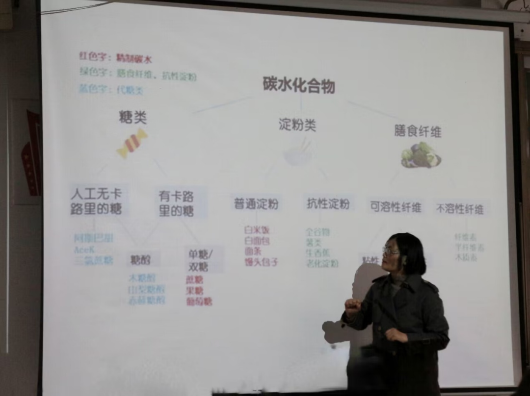 首先,尹博士通过一些精美的照片领着我们走入碳水化合物的世界。尹博士不仅详细地为我们介绍了碳水化合物的分类,还紧跟时代热点“减肥”这一话题,为我们着重介绍了人工无卡路里的糖和抗性淀粉。