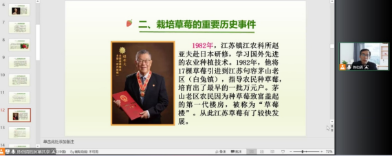 随后,陈教授详细介绍了栽培草莓中发生的重要历史事件,列举了江苏镇江赵亚夫奔赴日本研修,学习国外先进的农业种植技术的科研经历,并回国指导农民种植草莓,培育草莓,做出了巨大贡献,极大地推动了江苏经济的发展,为我国在草莓种植方面起到了引领作用。通过赵亚夫在种植草莓上做出的贡献,让同学们感受到了浓浓的爱国热情,相信不久的将来,我们也可以成为祖国的骄傲,为祖国献出自己的一份力量。