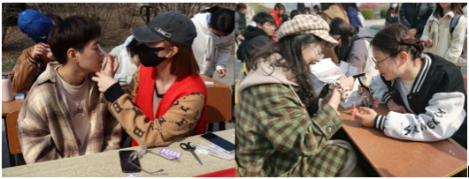 2023年3月5日,太阳成集团122ccvip在图书馆前集中组织开展了形式多样的学雷锋志愿服务活动,如修剪头发,美甲DIY,手机贴膜,衣服缝补等,关工委周青教授参与了此次活动,为此次学雷锋精神活动增添了一份生气。