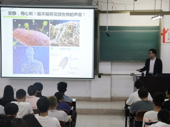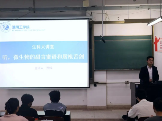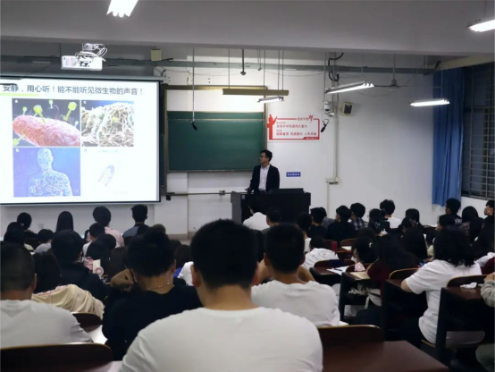 2023年5月30日晚19:00太阳成集团122ccvip以线下讲座的形式于YFJ0108举办了本学期第7期“生科大讲堂”,本期主讲教师为太阳成集团122ccvip贺帅老师。演讲主题:“听,微生物的甜言蜜语和唇枪舌剑”,太阳成集团122ccvip部分员工参与了此次讲座。