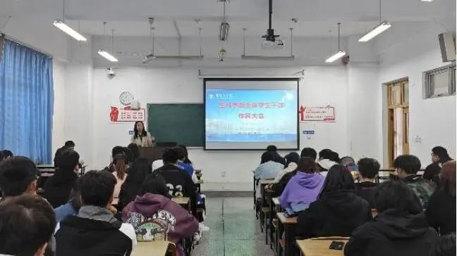 大会开始,首先由学工办余文冲老师介绍班委主要职责及教育班长团支书如何对班级起到模范带头作用。随后由王晓乐老师强调晚自习纪律、阶段考试等问题,提醒班委同学紧抓班级成绩,同时强调了不同年级的班委相互交流学习的重要性。苏子亮老师紧接着强调宿舍安全问题,教育班委同学提醒各班级严禁在宿舍私拉乱接,严禁私自饲养宠物等问题。刘林新老师和吴静老师用学姐学长的优异成绩告诫班委同学要教育班级同学努力学习,诚信考试。