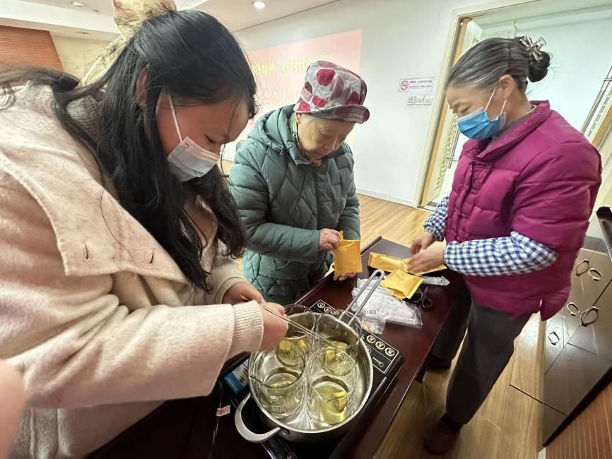 志愿者与福利院老人进行土蜂蜡润唇膏的制作