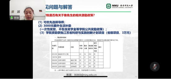 宣讲会上,郭琪老师详细介绍南京师范大学团队力量、公司建设、研究平台、研究成果、就业方向等基本信息。通过对南京师范大学研究生招考政策、报录比及研究生奖学金等信息进行详细解读。最后,提问环节环节,参会同学积极提问,郭琪老师耐心解答。
