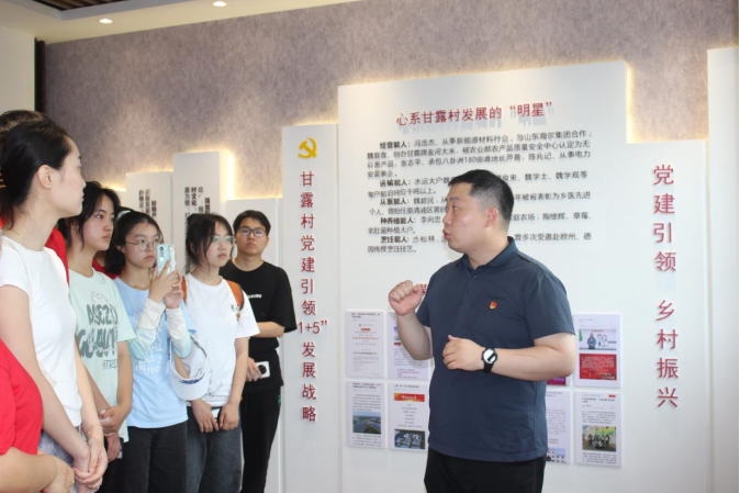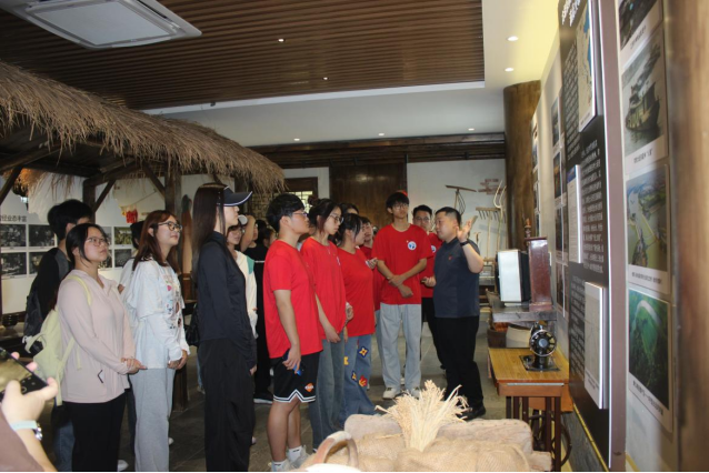 在党建带团建的鲜明旗帜下,实践团成员们满怀激情与期待,走进了甘露村的村史馆。这里,是甘露村历史与文化的缩影,每一幅泛黄的老照片、每一件古朴的农具,都仿佛在诉说着往昔的故事。在村书记的深情讲解下,实践团成员们仿佛穿越了时空,与过去的村民们进行了一场心灵的对话。他们用心聆听、仔细观察,深刻感受到了乡村文化的独特魅力和村民们对家乡的深厚情感。