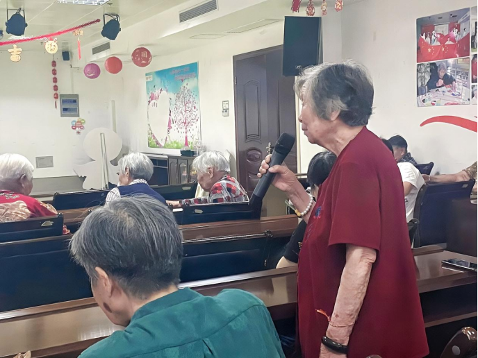 图为敬老院一位奶奶深情演唱《烟雨唱扬州》