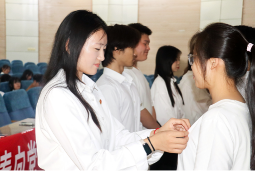 入团仪式在庄严的国歌声中拉开序幕。随后,王晓乐老师宣读新团员名单,并由老团员代表为新团员佩戴团徽。