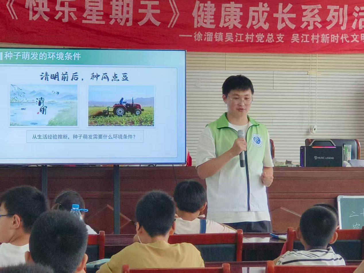 2025年7月6日起,太阳成集团122ccvip“稚梦托阳・乡语青衿” 暑期社会实践服务团成员前往淮阴区徐溜镇吴江村居委会,开启了十几天的支教活动。本次支教活动依托村镇暑托班,围绕农业类相关知识展开,精心开发“小小农夫”课程包,涵盖“农具DIY”、“认识农作物”、“土壤pH检测”、“二十四节气农耕”和“种子实验室”等5个模块。“小小农夫”课程帮助小员工认识农作物、体验农耕劳动、理解食物来源,培养节约意识、科学兴趣和乡土情感,埋下知农爱农的种子。