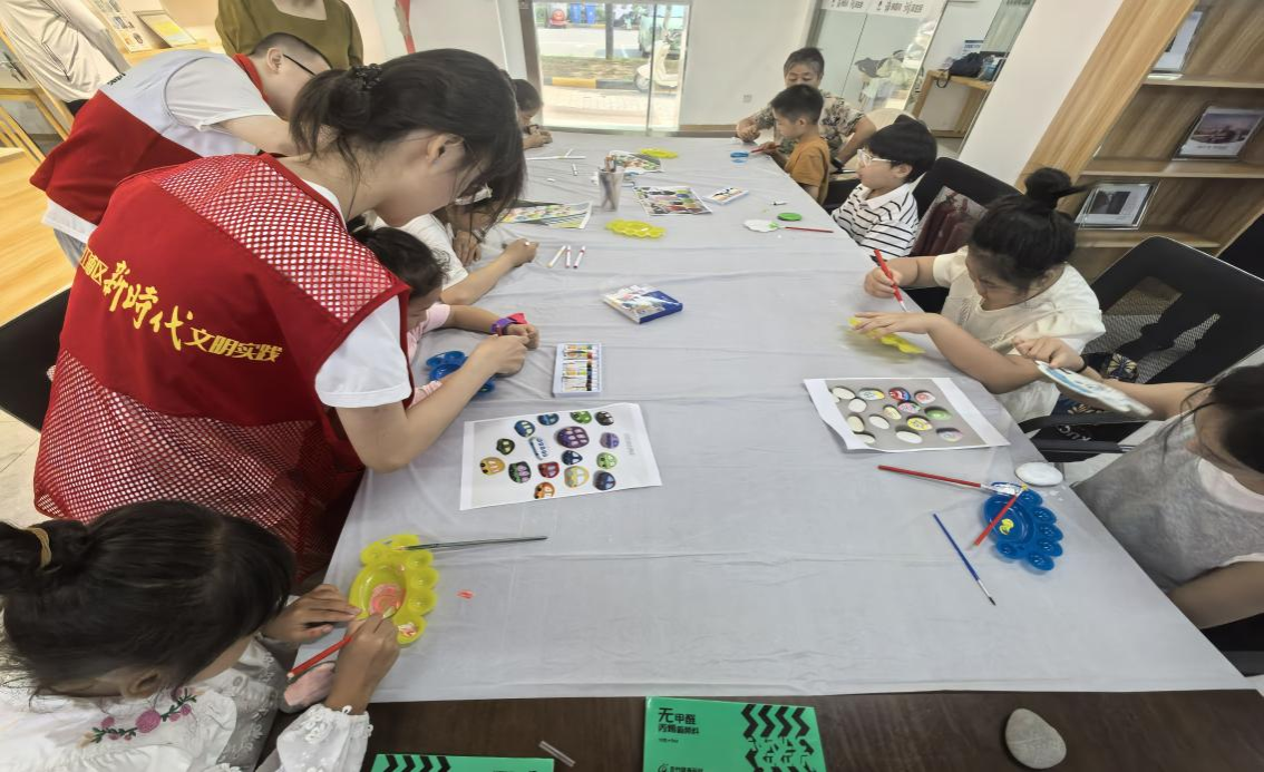 石头画环节乐趣十足。实践团成员带领孩子们收集形状各异的石头,开启一场创意绘画之旅。孩子们把这些天然石块当作独特的画布,用斑斓色彩勾勒心中的美好图景。有的孩子画了可爱的小动物,有的画了美丽的花朵,还有的画了梦幻的城堡……每一件石头画作品都盈满童真意趣,恰似一扇扇窗口,映照出孩子们丰盈澄澈的内心世界。这场创作体验,不仅让孩子们的艺术素养在实践中得以积淀,更让他们的审美感知在斑斓色彩与奇思妙想中持续提升。