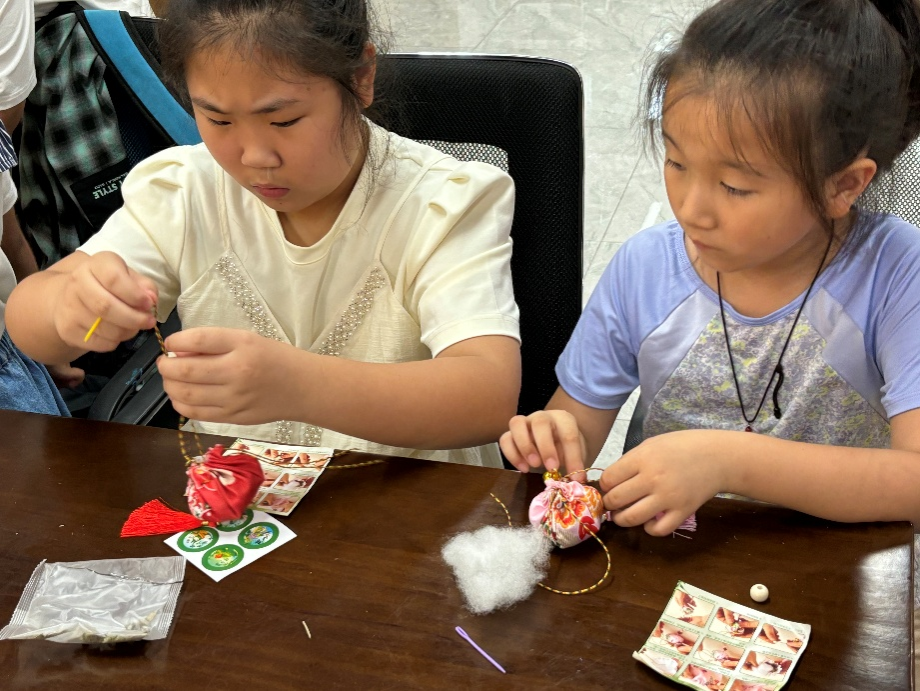 香囊制作兼具深厚的文化意涵与生活实用价值。实践团成员向孩子们讲述香囊在传统文化中驱虫辟邪、祈福安康等寓意,分发香料、布料、丝线等材料。孩子们认真地将香料装入香囊,小心翼翼地进行组装。不一会儿,一个个小巧玲珑、香气四溢的香囊诞生了。香囊制作是一场“文化浸润 + 情感培育 + 能力塑造”的综合体验,孩子们在触摸传统的同时,学会表达情感、收获成长,让小小的香囊承载起远超器物本身的意义。