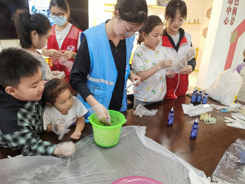 扎染体验课上,实践团成员化身文化使者,向孩子们讲述这门中国民间传统染色工艺的源流与独特魅力。从历史脉络的演进到别具一格的制作技法,孩子们听得全神贯注,眼中满是对传统技艺的好奇与向往。随后,成员们耐心示范,手把手指导孩子们用棉线将布料捆扎出巧妙造型,调配出层次丰富的染料,完成染色、拆线等步骤。孩子们尽情挥洒想象力,将布料扎成各种趣致形态。当看到自己亲手制作的扎染作品呈现出独一无二的图案时,他们脸上洋溢着自豪与喜悦。这场扎染体验,让孩子们真切触摸到传统手工艺的深厚底蕴与灵动美感,在实践中涵养了创造力与动手能力,让传统文化的种子悄然播撒在心间。