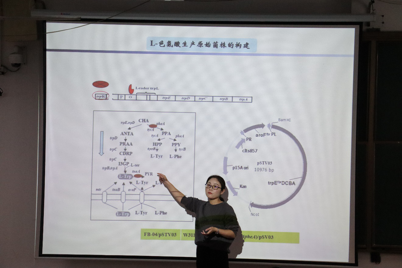 最后刘博士讲述人工改造后的菌种可减少副产物乙酸的积累,提高L-色氨酸的转化率和L-Trp产量,并具体介绍了其改造的过程。