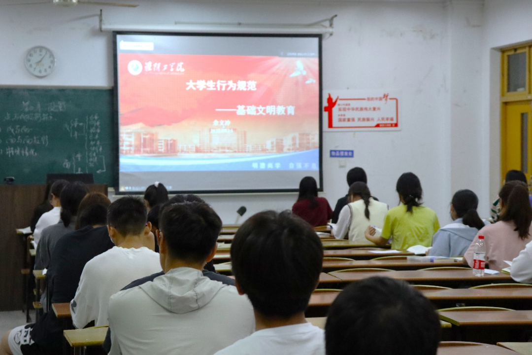 为教育新生加强自身修养,提高综合素质,树立公司老员工健康、文明、阳光、向上的美好形象,营造文明和谐的校园氛围。于9月15日晚间8:00在主会场22108,分会场各班级晚自习教室举办会议,本次会议由公司党委副书记、副经理夏雪芹主讲基础文明教育,学工办副主任余文冲主讲老员工行为规范,生科院全体新生参与会议。