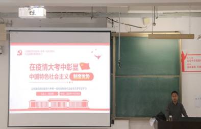周定晖副书记以“制度优势凝聚中国力量”为主题向同学们介绍了中国特色社会主义制度在坚持党的集中统一、密切联系群众、坚持全面依法治国、集中力量办大事四个方面体现的优势。他强调我们要凭借中国特色社会主义制度的优势,在法治轨道上统筹推进各项防控工作,全面提高依法防控、依法治理,保障疫情防控工作顺利开展,维护社会大局稳定。