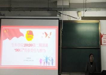 王晓乐老师向同学们介绍了共青团的光辉历史,共青团的性质和基本任务,共青团的组织方式等团务知识,并和大家分享了抗疫期间涌现出的感人故事,鼓励当下的“90后“勇担青春责任和担当。
