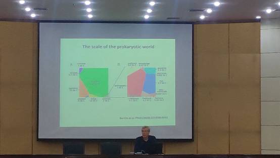 Whitman教授主要介绍原核生物的现代概念、种类、划分的依据以及它与真核生物的区别,并推测真核生物具体何时起源于原核生物,以及未来它可能为人类带来福祉。报告结束后,同学们积极用英语向教授提问并与教授交流,现场气氛也愈加活跃,讲座结束同学们仍意犹未尽。