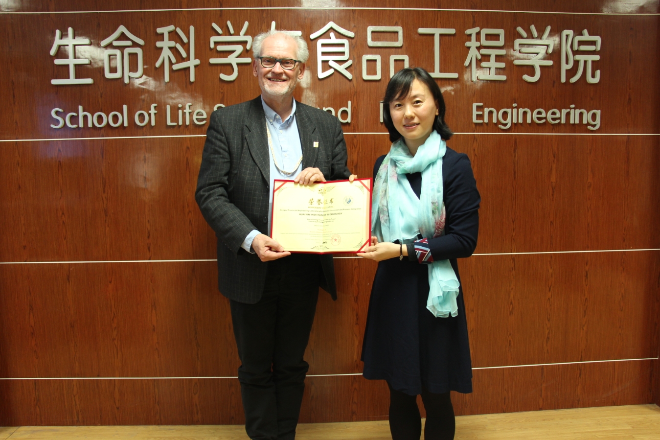 杨正亚副董事长现场为Peter Proksch教授颁发了公司荣誉教授聘书,太阳成集团122ccvip赵玉萍经理为Peter Proksch教授颁发江苏省生物质转化与过程集成工程实验室工作荣誉证书。