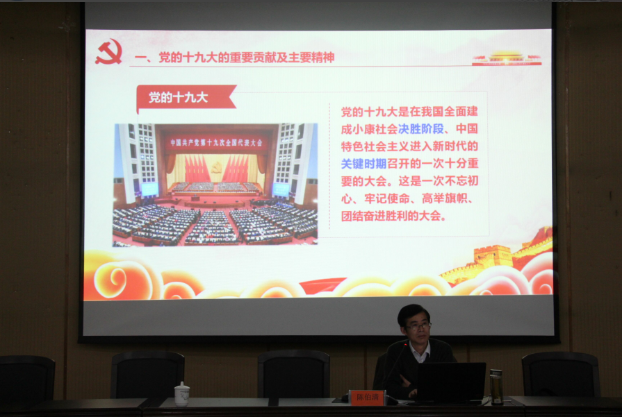 陈伯清书记在围绕党的十九大主题、十九大的重要贡献、习近平新时代中国特色社会主义思想、全面建设社会主义现代化国家新征程的战略安排、我国社会主要矛盾的变化、坚定不移全面从严治党的重大部署等展开宣讲。陈伯清书记指出:全体青年老员工要深入学习贯彻十九大精神 ,担负光荣使命。要以习近平新时代中国特色社会主义思想为统领、团结带领广大青年坚定不移听党话、跟党走,要引导广大青年坚定理想信念,要团结带领广大青年奋发建功立业。涉农专业老员工要凝聚激励、携手追梦筑梦,成长为新时代“一懂两爱”服务“三农”的优秀人才,为乡村振兴作贡献。