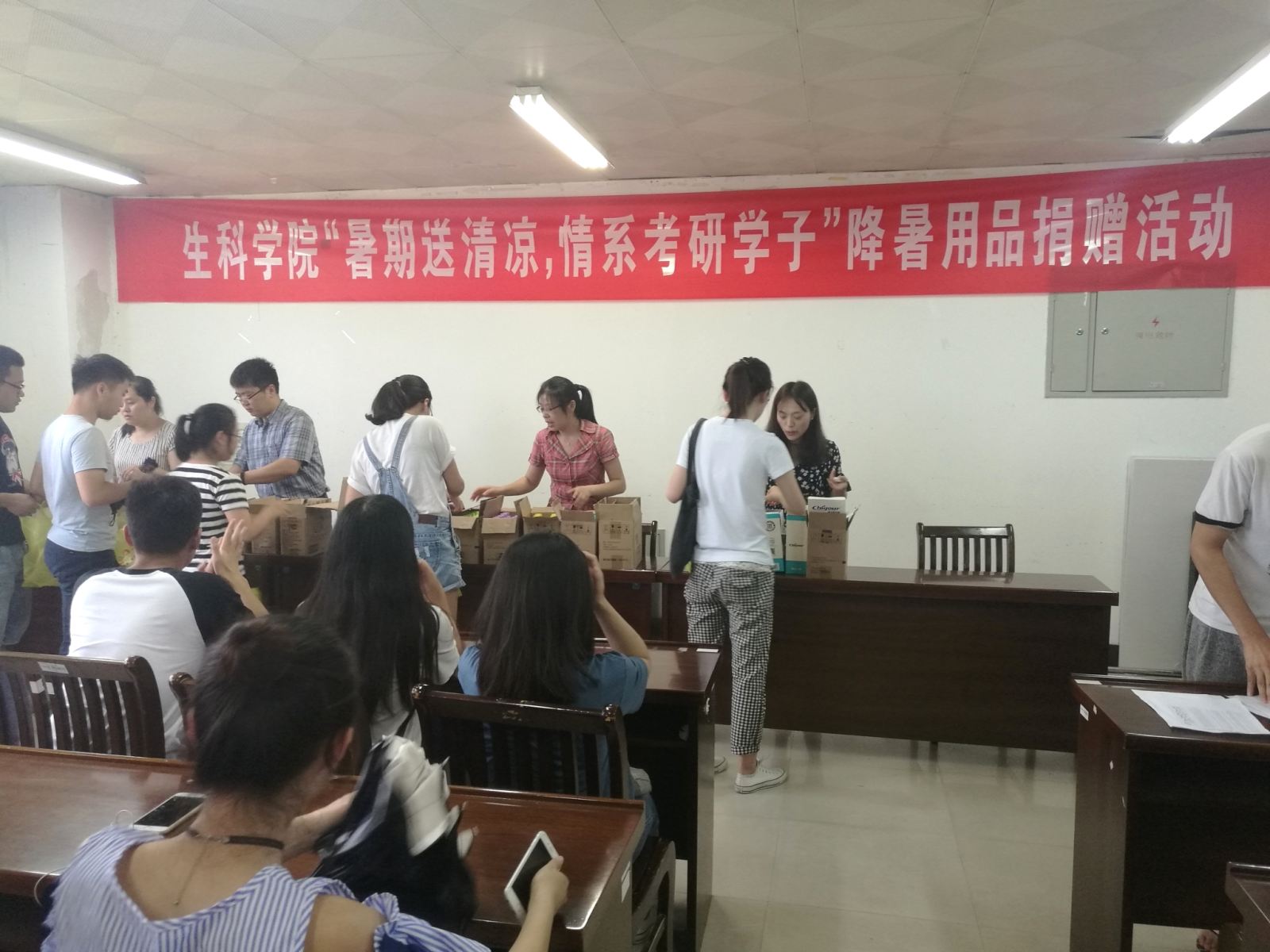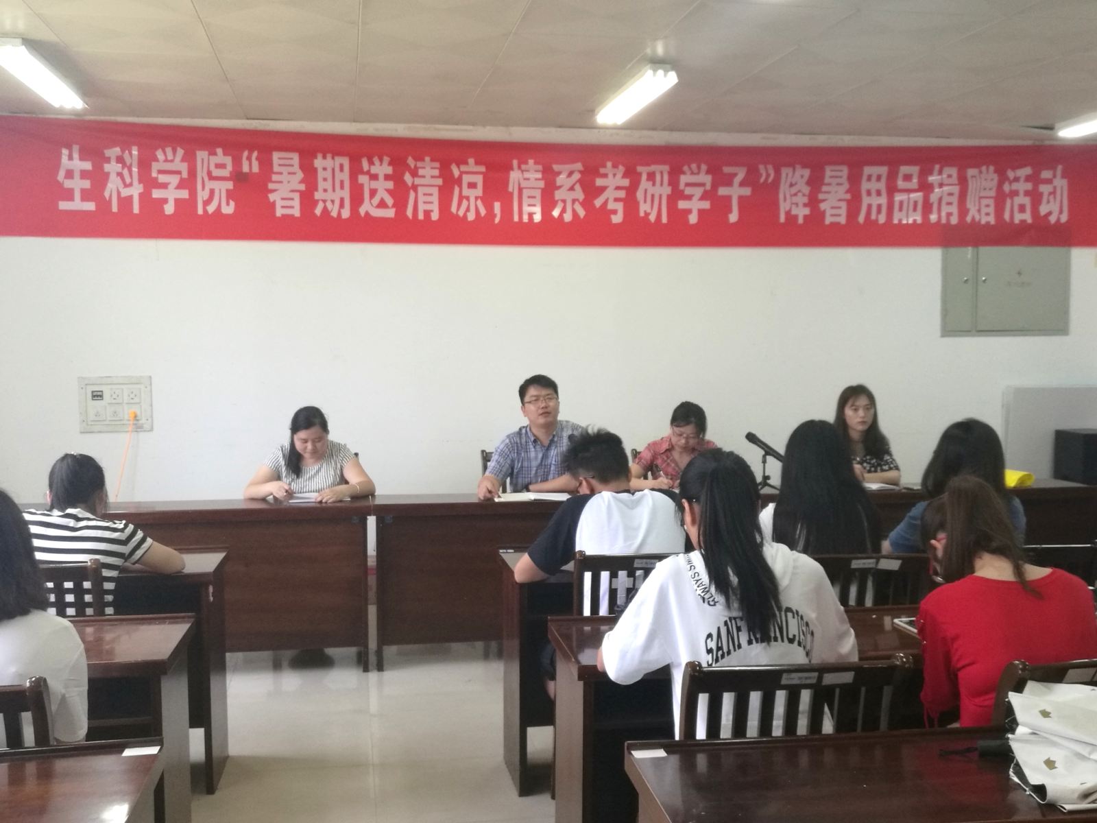 7月12号上午,太阳成集团122ccvip于行成楼208室举办了“暑期送清凉,情系考研学子”降暑用品捐赠活动。党委副书记刘毅出席会议并讲话,学工办主任王明霞、辅导员张爱芳、王江川以及14级考研留校员工代表参加了此次活动。