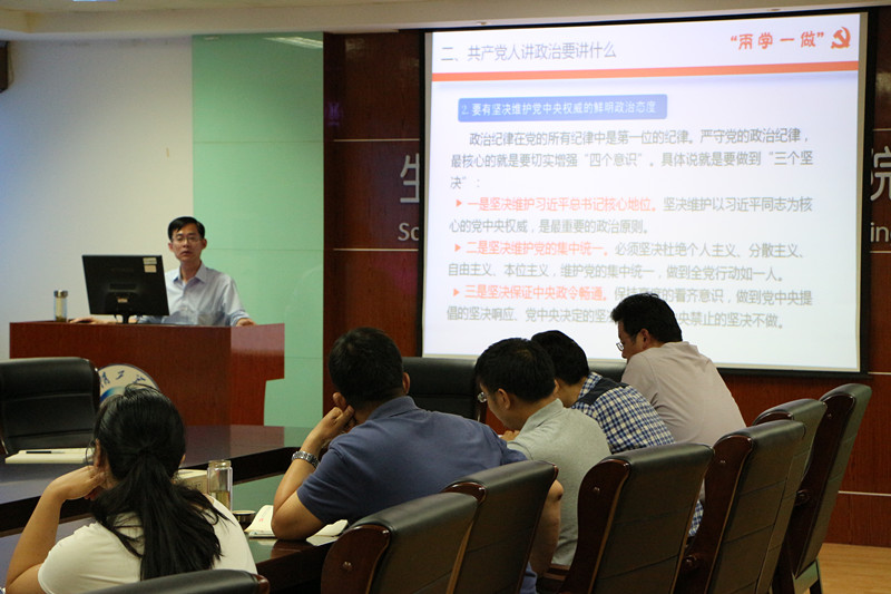 陈书记以“旗帜鲜明讲政治”为题做了专题党课报告。报告以今年2月习近平总书记在省部级主要领导干部专题研讨班上的重要讲话精神和5月26日省委书记李强在省管干部专题培训班开班讲话精神,进一步强调全体党员要认真学习贯彻习近平总书记系列重要讲话精神,旗帜鲜明讲政治,忠实履行党的教育事业,做忠诚干净担当的共产党人为主线,开宗明义,阐述了“旗帜鲜明讲政治”的重大意义,并从“共产党人为什么要讲政治、共产党人讲政治要讲什么、如何增强讲政治的高度自觉”三个方面,结合公司工作实际和发展情况,列举典型案例,系统解读在人才培养、教学科研、社会服务工作中如何做到“旗帜鲜明讲政治”。他要求党员教师进一步增强政治意识、大局意识、核心意识、看齐意识,时刻与以习近平总书记为核心的党中央保持高度一致,以优异成绩迎接党的十九大胜利召开。