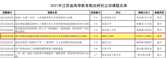 根据江苏省教育厅发布《关于公布2021年江苏省高等教育教改研究立项课题评选结果的通知》,公司朱永江教授和王朝宇教授共同申报的“新工科新农科融合的地方院校涉农专业人才培养模式创新研究与实践”获得重点项目立项;公司陈晓明教授和创新创业公司赵坚副经理共同申报的“地方应用型高校创新创业教育生态系统的构建与实践”获得一般项目立项。教育教改研究课题是深化教师培养模式的改革、推动应用型人才培养教育转型升级、提高教师公司产品水平,提升员工培养质量、形成优秀教学成果的一项重要抓手。公司近年来对公司产品改革非常重视,公司教师参与度高、积极性强。上述2个江苏省高等教育教改项目的立项,极大的促进公司公司产品质量的提升。