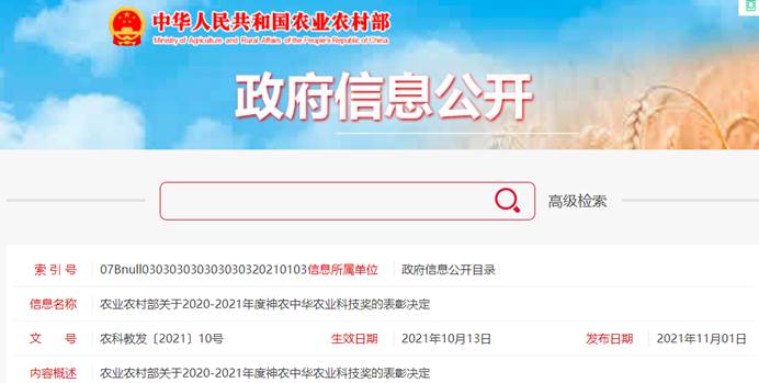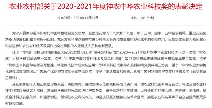 为深入贯彻习近平新时代中国特色社会主义思想,全面落实党的十九大和十九届二中、三中、四中、五中全会精神,推进实施创新驱动发展战略和乡村振兴战略,充分发挥科技创新在推进乡村全面振兴和农业农村现代化中的引领作用,农业农村部决定表彰2020-2021年度神农中华农业科技奖(农科教发〔2021〕10号)。其中,一等奖42项,二等奖47项,三等奖60项。公司张国良教授领衔的科研成果《水稻新型育秧基质及其机插栽培关键技术优化与集成应用》获三等奖,这是公司首次以第一完成单位在部级政府科技奖励中取得的重大突破。