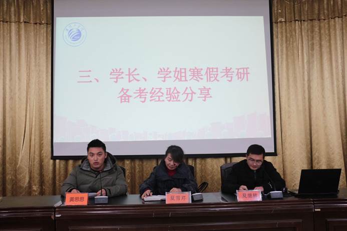 然后,园艺1181包永蓉、生物1181王娟、新能源1181黄思思、食品1183朱悦、农学1181杨莹、园艺z2191付元生就如何选择考研院校、考研备考的方法及考研备考过程中的心态变化等多个方面的经验进行了分享,并且着重介绍了寒假备战考研的注意点。最后,夏雪芹副书记进行了寒假安全知识的讲解,同时对寒假考研备考提出要求,希望同学们要抓紧时间,劳逸结合,制定一个合理的考研备考计划。
