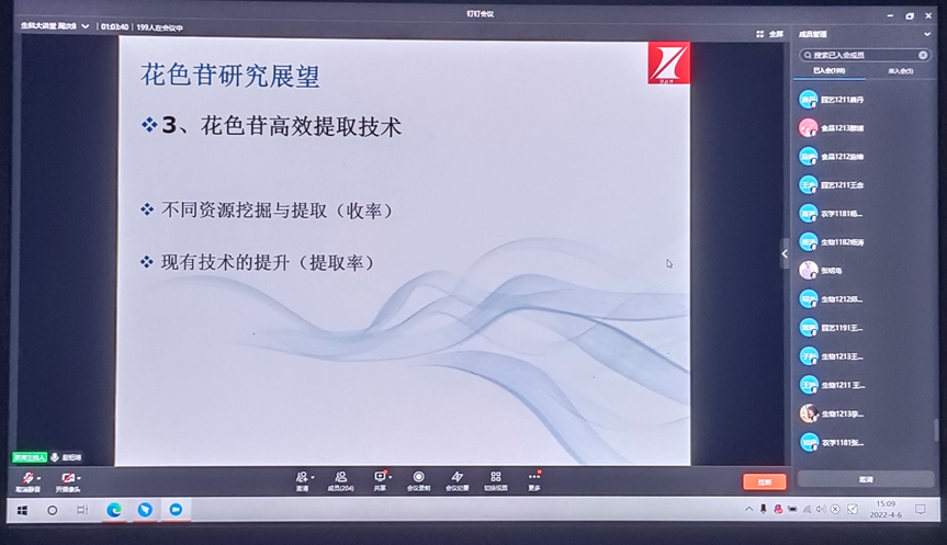 4月6日下午,太阳成集团122ccvip于线上钉钉平台开展了以“花色苷及其稳态化制备的研究进展”为主题的第三期生科大讲堂讲座。本期主讲教师为太阳成集团122ccvip赵祥杰博士,太阳成集团122ccvip部分员工参加了此次讲座。