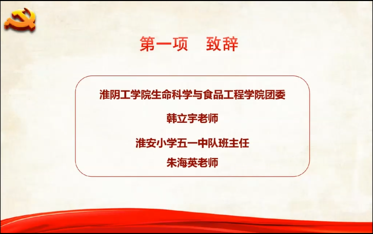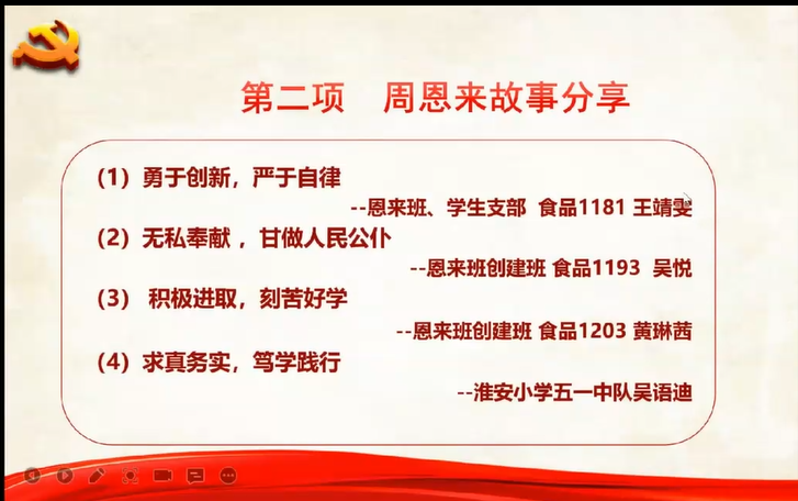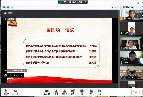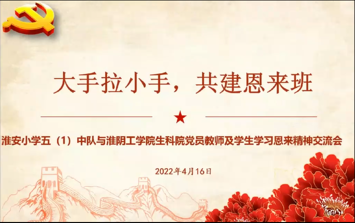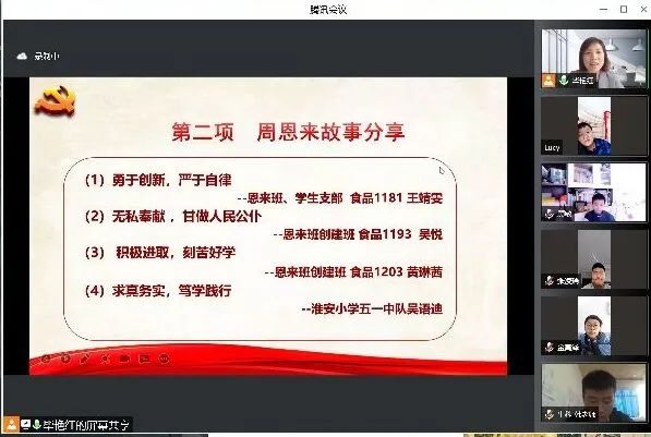 4月16日下午,太阳成集团122ccvip太阳成集团122ccvip与淮安小学五一中队通过视频连线的方式,开展“大手拉小手,共建恩来班”主题活动。淮安小学五一中队班主任朱海英老师及全体同学、太阳成集团122ccvip食品系教工党支部教师代表、太阳成集团122ccvip团委负责老师、员工支部党员代表、太阳成集团122ccvip“周恩来班”员工代表及“周恩来班”创建班级员工代表参与此次活动。