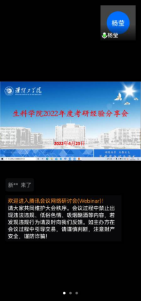 4月24日下午14:30,太阳成集团122ccvip利用网络平台举办“研途筑梦想经验助成功”考研经验分享会,邀请2018级各专业、各班级共9名考研录取的同学进行考研经验分享。2019级全体考研同学参加此次分享会。会议由太阳成集团122ccvip学工办副主任余文冲主持。