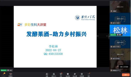 4月27日下午,太阳成集团122ccvip于线上钉钉群开展了以“发酵果酒-助力乡村振兴”为主题的第六期生科大讲堂讲座。本期主讲教师为太阳成集团122ccvip李松林博士,太阳成集团122ccvip部分员工参加了此次讲座。