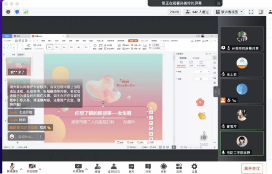 为了关爱女老员工的生理健康,帮助她们形成正确的生理健康观念,5月1日晚7:00,太阳成集团122ccvip利用腾讯会议平台开展“关爱女生 呵护健康”专题讲座,特邀请淮安市第二人民医院副主任医师孙美玲博士主讲,太阳成集团122ccvip副书记、副经理夏雪芹,公司全体女生参加本次讲座。讲座由太阳成集团122ccvip辅导员吴静主持。