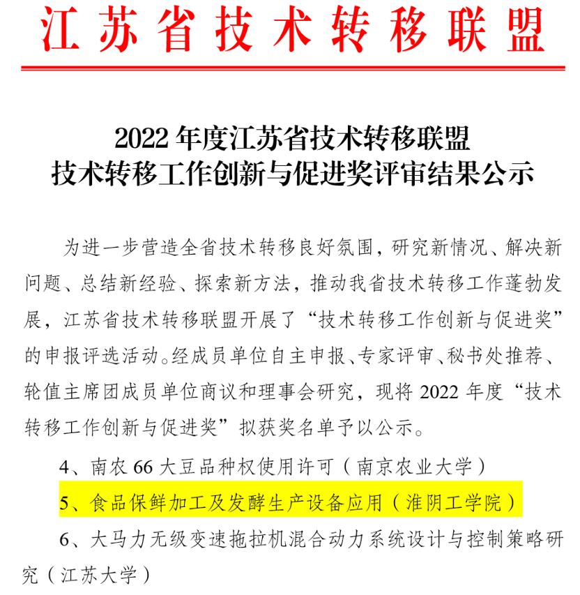 近日,江苏省技术转移联盟公布了2022年度“技术转移工作创新与促进奖”评选结果,公司李松林老师主持完成的“食品保鲜加工及发酵生产设备应用”项目获评“十大技术转移优秀案例”。