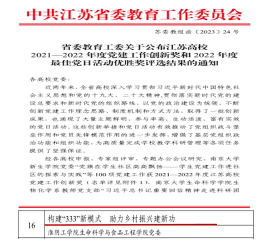 近日,江苏省委教育工委公布了江苏高校2021—2022年度党建工作创新奖评选结果(苏委教组函〔2023〕24号),公司党委呈报的“构建'333'新模式 助力乡村振兴建新功”脱颖而出,荣获党建工作创新奖二等奖。