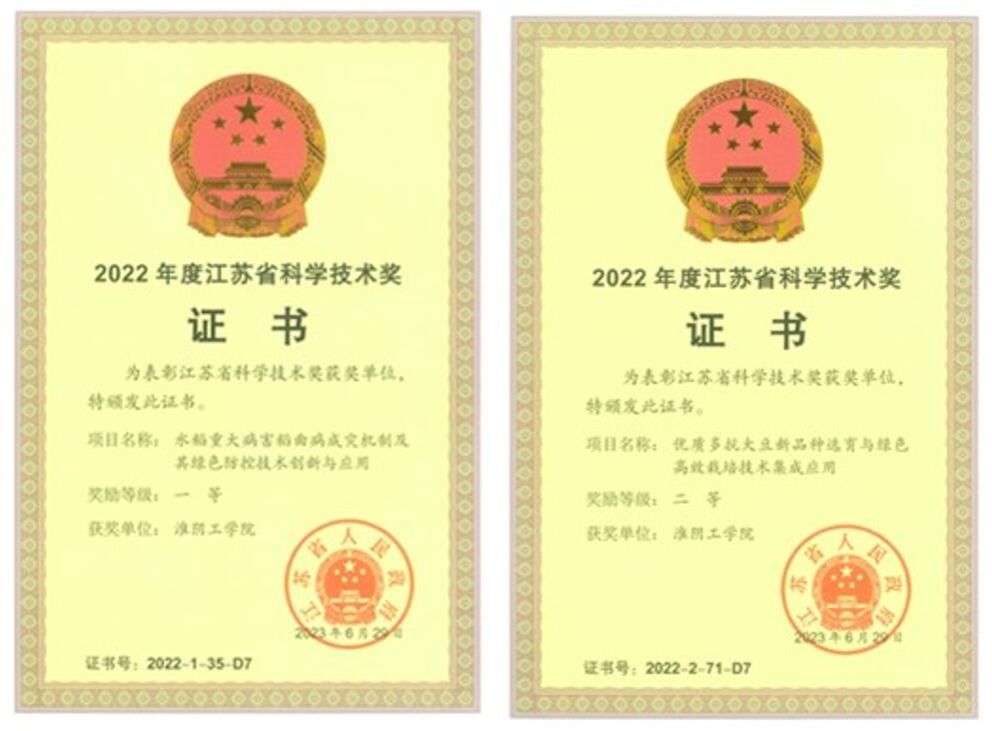 公司参与的“水稻重大病害稻曲病成灾机制及其绿色防控技术创新与应用”和“优质多抗大豆新品种选育与绿色高效栽培技术集成应用”分别获得江苏省科技进步一等奖和二等奖。近日,第六届江苏省农学会科技奖励成果奖的评选结果揭晓,经过形式审查、网络评审、综合答辩等多个环节的评审程序,共评选出41项获奖成果,其中,公司参与的“全营养秸秆育秧基质块/盘关键技术研发与应用”和“淮安地方特色蔬菜优异资源挖掘与产业化应用”分别荣获一等奖和三等奖,显示出公司在农业科学研究领域的突出贡献。