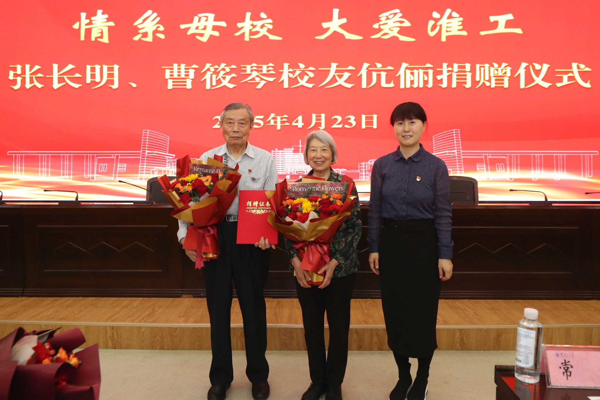 张长明对母校师生的热情接待表示感谢,也为母校事业的快速发展感到自豪。他深情表示,将多年积蓄捐赠给母校是他和夫人曹筱琴多年来共同的愿望。希望能为祖国的教育事业和母校的建设发展略尽绵薄之力,帮助部分贫困学子完成学业,助力公司培养更多的栋梁之材;期望青年员工牢记使命,传承淮工精神,勤奋学习科技本领,积极开拓创新,为乡村振兴建功立业,为母校增光添彩。