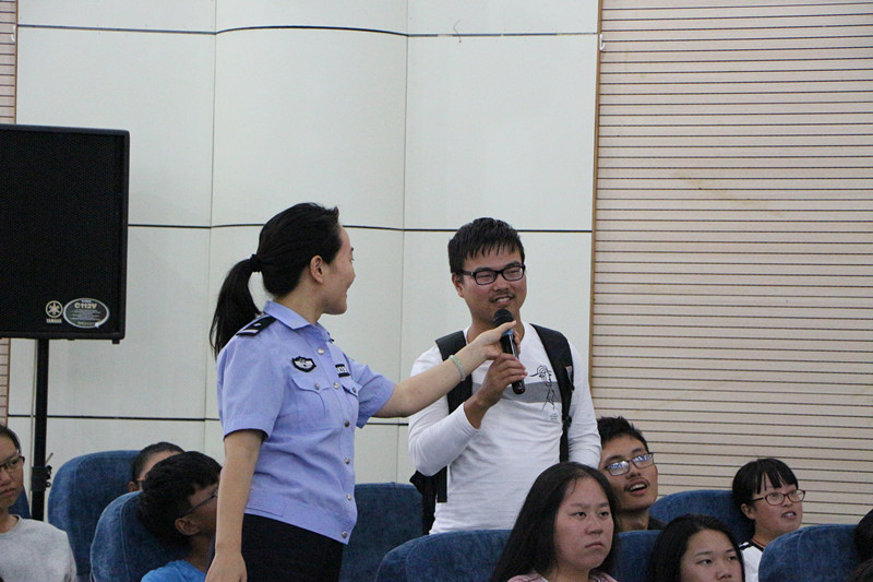 踪警官首先给同学们放映了一部防诈骗的宣传片,视频中各种生动真实的案例让同学们对于诈骗的形式和常用手段有了初步的了解。随后,踪警官结合生活中常见的骗局案例,说明了当前的诈骗手段与影响后果,并告诫同学们不管诈骗手段如何改变,一定要看清诈骗的本质,不要轻易泄露个人信息等。同时,也提醒广大新生提高防范意识。最后,踪警官结合实际案例向大家介绍了交通安全以及校园贷等方面的知识,并向女生示范了危机时刻的防身术。