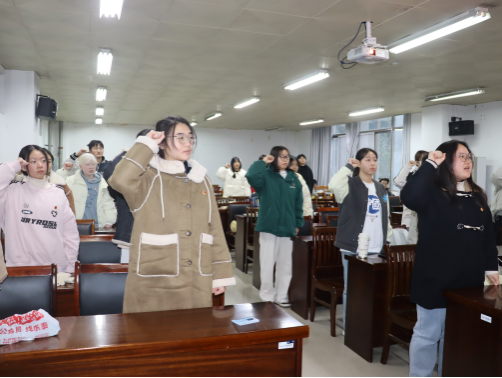 仪式上,伴随着激昂的团歌,老团员代表为新团员佩戴上了象征着青春与责任的团徽。这一刻,不仅是对新团员身份的认可,更是对他们未来道路的期许。新团员们面对团旗,举起右拳,庄严宣誓:“我志愿加入中国共产主义青年团,坚决拥护中国共产党的领导……”铿锵有力的誓言,在会议室内回荡,表达了他们加入共青团后的坚定信念和决心。